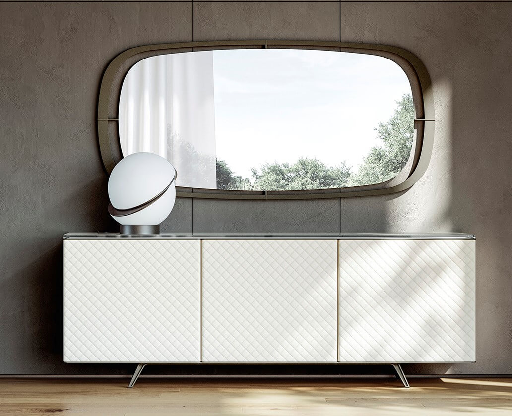 Comoda Atico este un model exclusivist, cu design contemporan și materiale premium. Fațadele ușilor sunt îmbrăcate în piele cu cusături decorative în formă de romb. Are trei uși batante, picioare înalte pentru curățare ușoară, iar blatul din sticlă neagră lucioasă adaugă eleganță și profunzime.