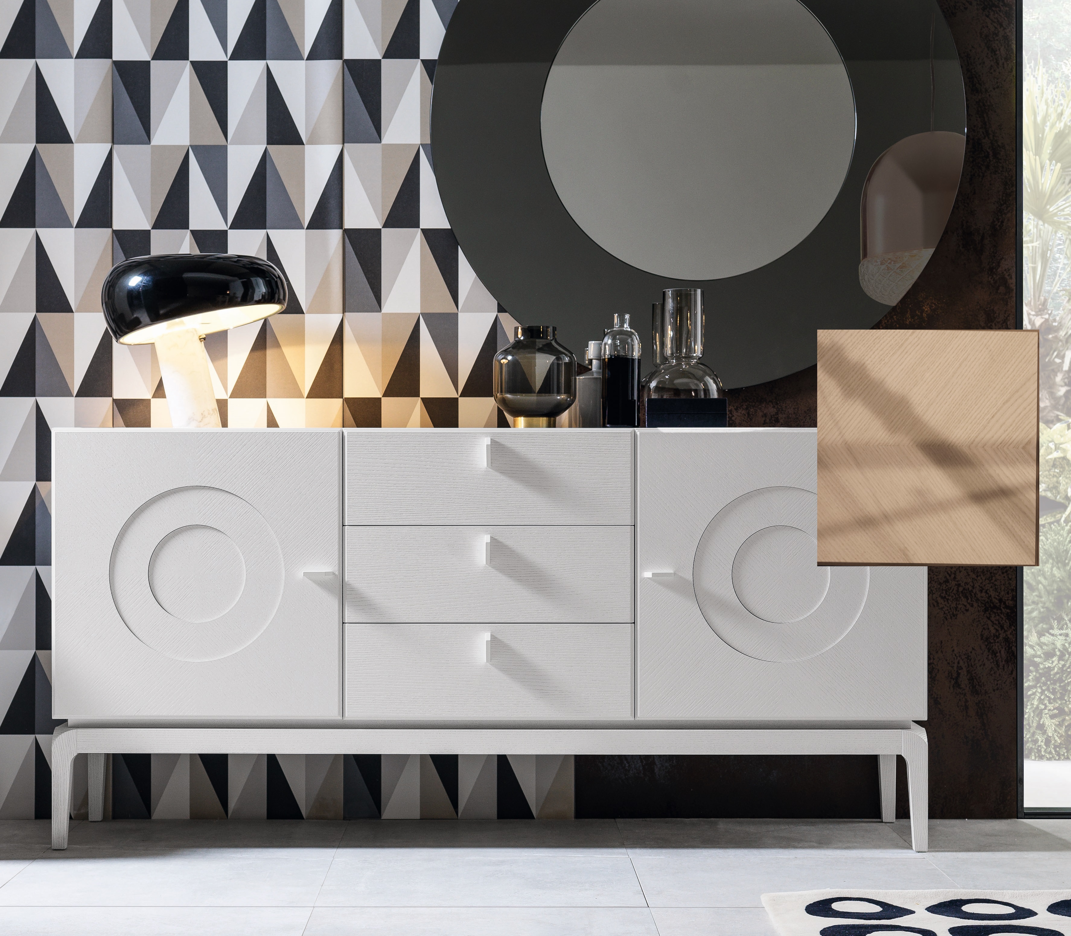Comoda Talento combină eleganța Art Deco cu rafinamentul subtil al stilului italian. Picioarele înalte din lemn masiv și ușile din MDF furniruit cu inserție 3D creează un design expresiv și modern. Furnirul bej adaugă căldură, iar mânerele din bronz completează piesa cu o notă luxoasă și sofisticată.