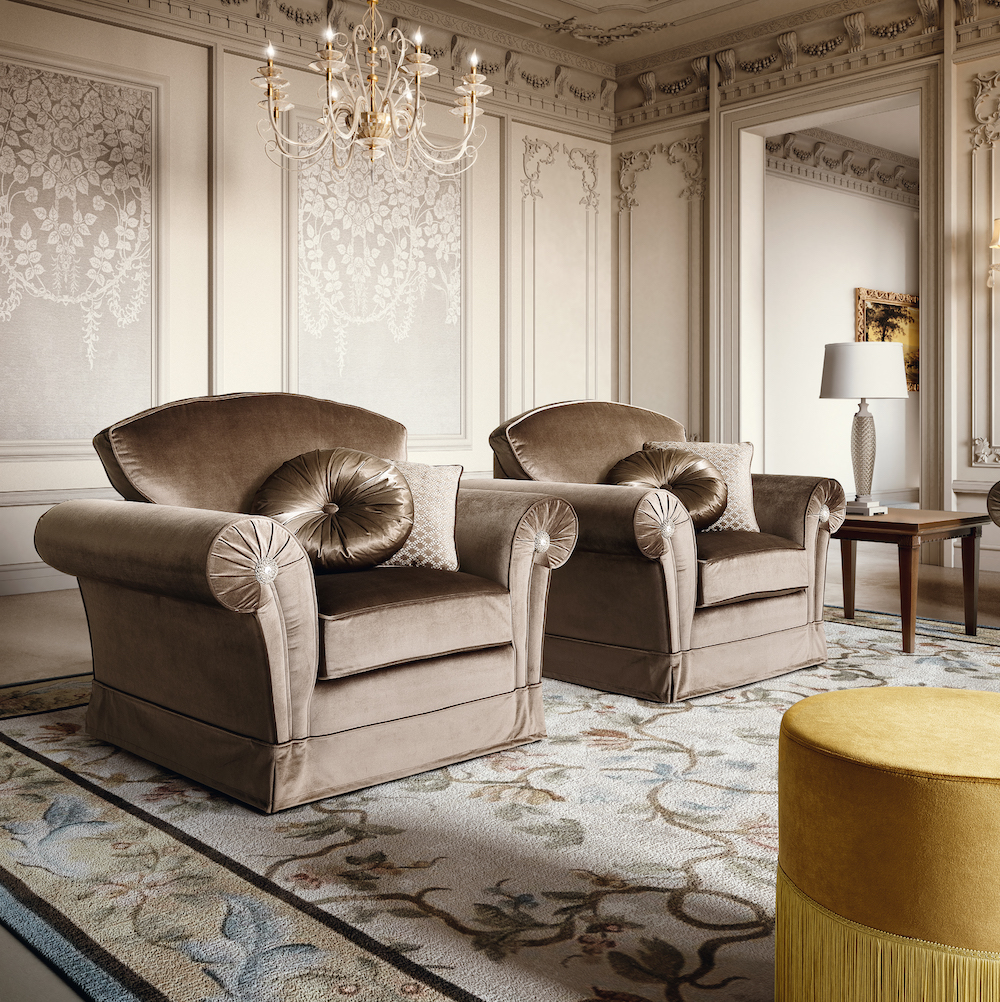 Fotoliul Nostalgia Sofa oferă o senzație imediată de confort și eleganță. Catifeaua densă, într-o nuanță bogată de maro închis, este completată de inserții cu cristale Swarovski pe cotiere, oferind un echilibru perfect între confort și rafinament italian.