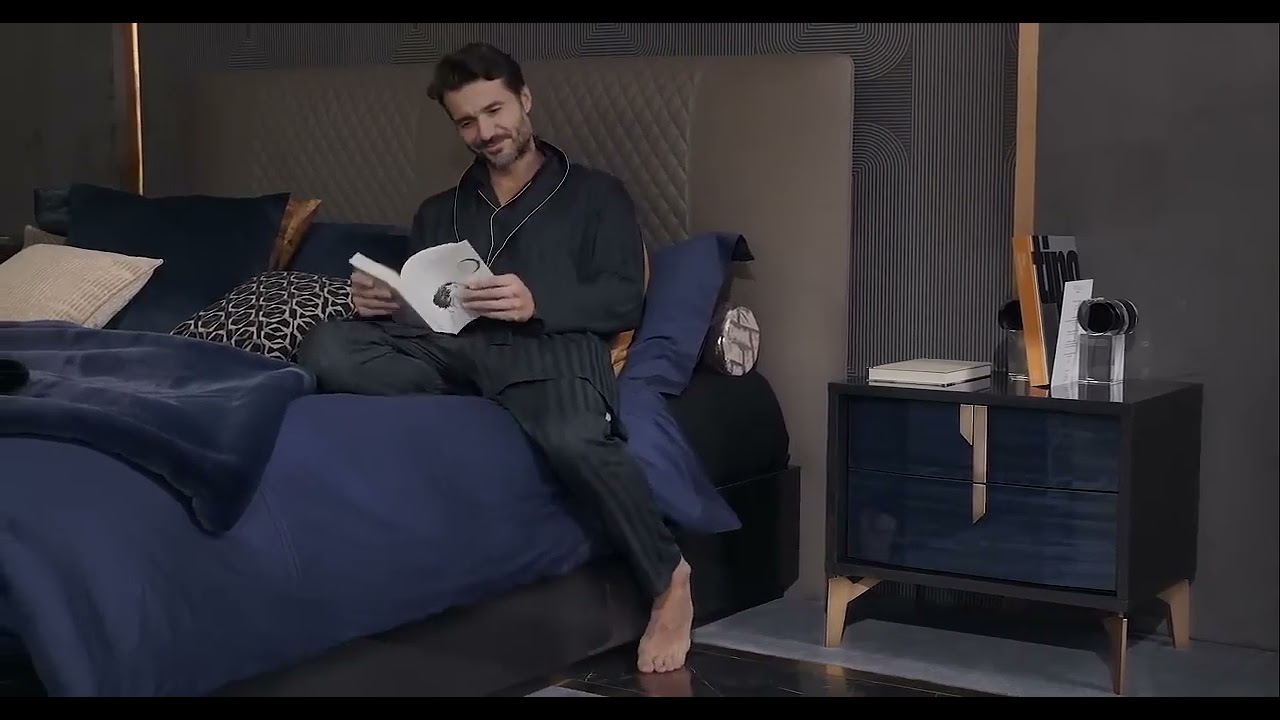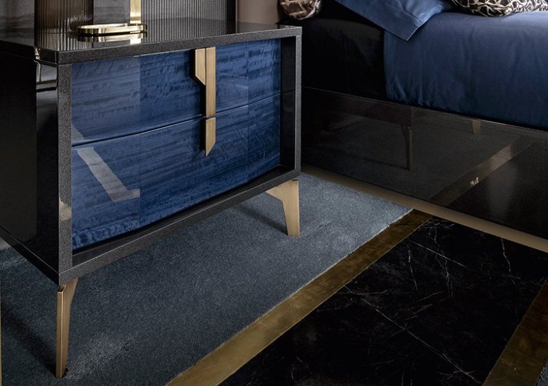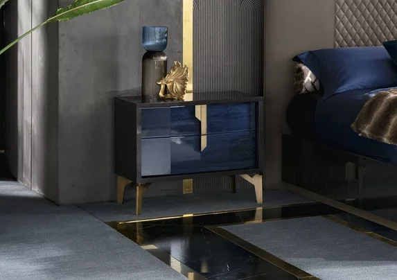 Noptiera Ochianum are corp lucios în nuanța grafit, iar fețele sunt realizate în structura lemnului de culoare albastră. Mânerele și picioarele din bronz adaugă rafinament și armonie modelului. Ochianum devine un adaos elegant pentru dormitor, oferind stil modern și estetică funcțională.