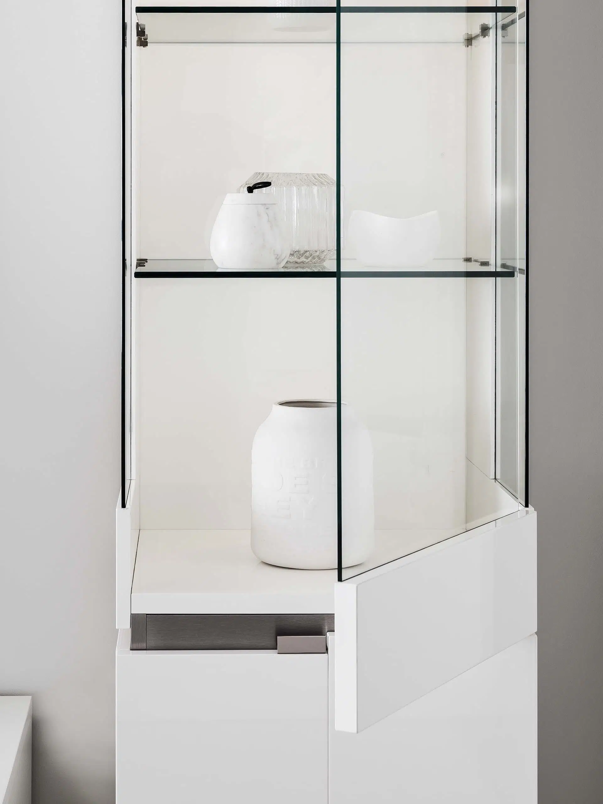 Витрина Artemide отличается современным дизайном, созданным для того, чтобы привнести в интерьер лёгкость и утончённость. Глянцевые белые поверхности, дополненные аккуратными серыми оттенками, формируют стильный и элегантный образ. Прозрачные стеклянные панели по обеим сторонам подчеркивают визуальную лёгкость конструкции и акцентируют внимание на каждом её элементе.