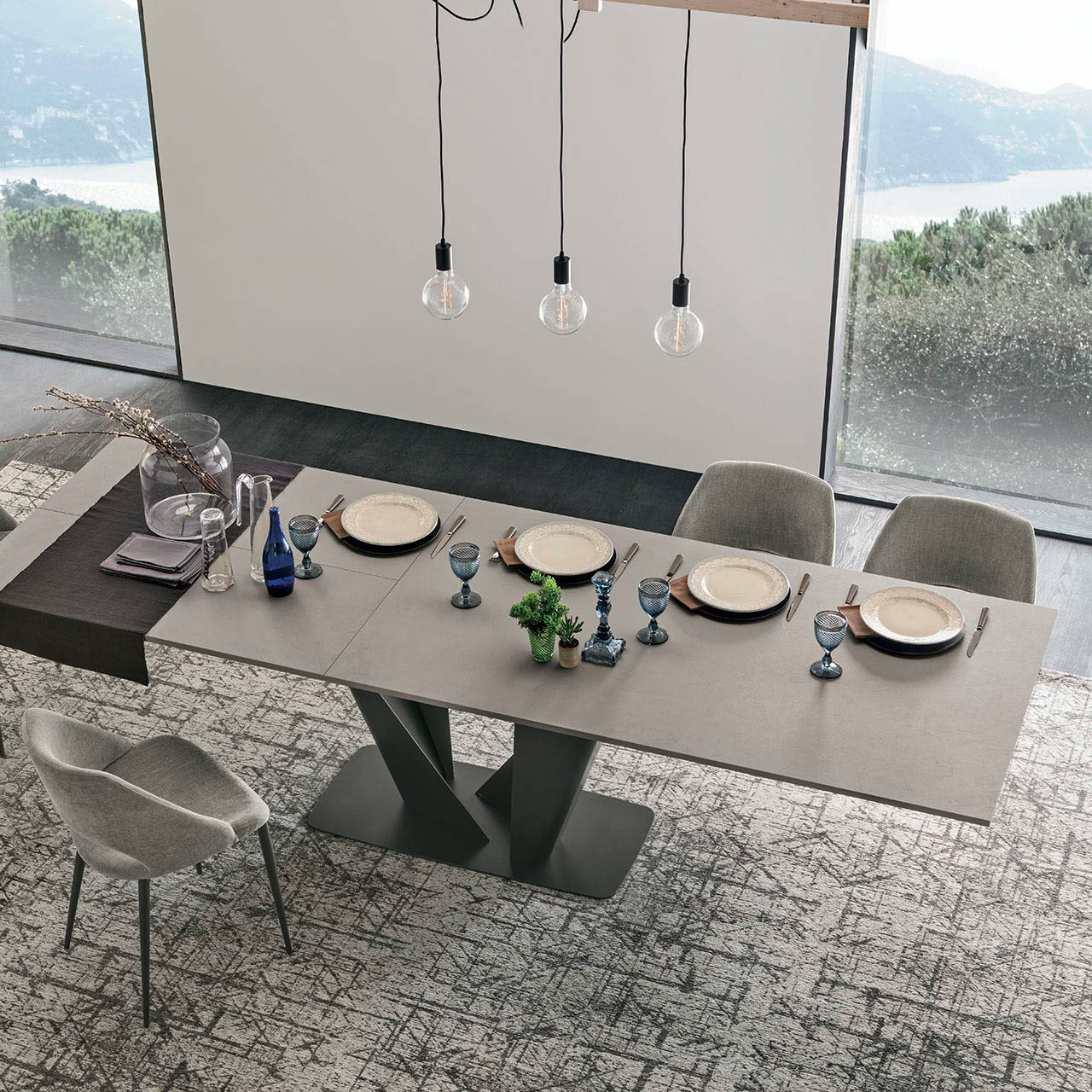 Модель Silver сочетает современную элегантность и итальянское мастерство. Столешница из устойчивого к царапинам материала с эффектом цемента прочная и простая в уходе. Раздвижной механизм увеличивает длину стола до 280 см, сохраняя гармоничные пропорции. Центральная база из антрацитового металла обеспечивает устойчивость и придаёт современный архитектурный акцент.
