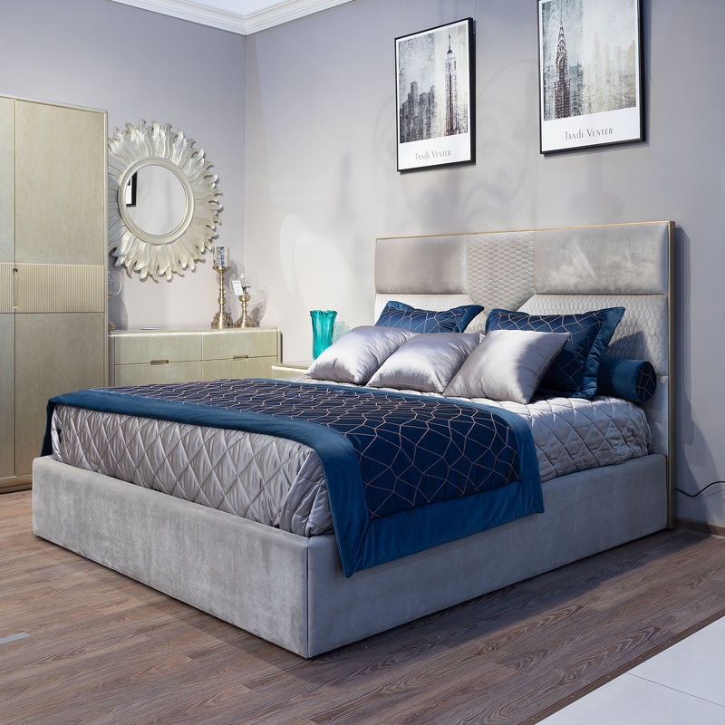 Кровать MODENA выделяется гармоничной элегантностью и продуманными деталями. Обивка из высококачественного серого велюра придаёт глубину и благородство, создавая атмосферу уюта и сдержанной роскоши. Высокое изголовье с вставками из окрашенного массива дерева становится выразительным акцентом, подчеркивая неоклассический характер модели.
